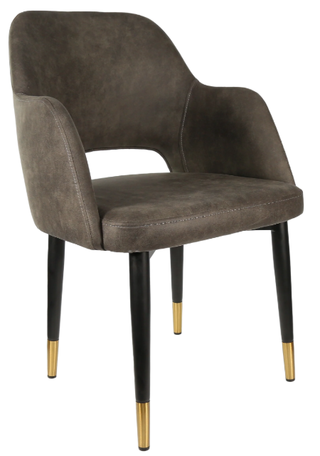 Made in Europe Brand: Durafurn 38mm steel tube with tapered leg Matt black powder coat with stainless steel, gold flec foot ring High quality foam & vinyl SWL:150kg 3-year warranty Stocked in (upholstery): Anthracite, Black & Taupe Vinyl - Anthracite, Light Grey & Navy Woven Fabric - Tan, Mocha & Charcoal Premium Vinyl - Avocado & Denim Velvet Stocked in (leg frame): Black Metal Legs with gold tips and footrail Suitable for indoor commercial application Dimensions: 820H x 570W 600D x 460 Seat Height Extensive selection of frame & upholstery choices available for custom orders Supplied unassembled