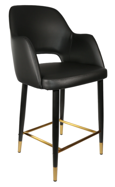 Made in Europe Brand: Durafurn 38mm black powdered steel tube with tapered leg Gold flec stainless steel foot ring High quality foam & vinyl SWL:150kg 3-year warranty Stocked in (upholstery): Anthracite, Black & Taupe Vinyl - Anthracite, Light Grey & Navy Woven Fabric - Tan, Mocha & Charcoal Premium Vinyl - Avocado & Denim Velvet Stocked in (leg frame): Black Metal Legs with gold tips and footrail Suitable for indoor commercial application Dimensions: 950H x 570W 600D x 645 Seat Height Extensive selection of frame & upholstery choices available for custom orders Supplied unassembled