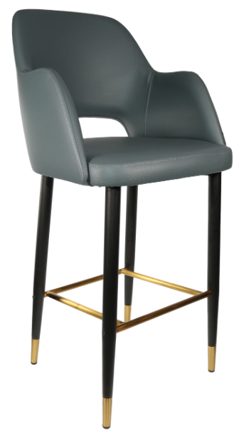 Made in Europe Brand: Durafurn 38mm black powdered steel tube with tapered leg Gold flec stainless steel foot ring High quality foam & vinyl SWL:150kg 3-year warranty Stocked in (upholstery): Anthracite, Black & Taupe Vinyl - Anthracite, Light Grey & Navy Woven Fabric - Tan, Mocha & Charcoal Premium Vinyl - Avocado & Denim Velvet Stocked in (leg frame): Black Metal Legs with gold tips and footrail Suitable for indoor commercial application Dimensions: 1050H x 570W 600D x 745 Seat Height Extensive selection of frame & upholstery choices available for custom orders Supplied unassembled
