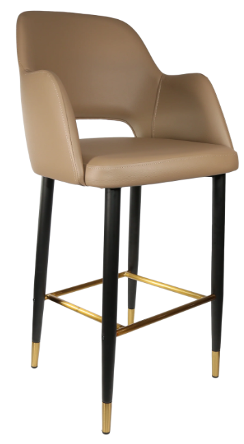 Made in Europe Brand: Durafurn 38mm black powdered steel tube with tapered leg Gold flec stainless steel foot ring High quality foam & vinyl SWL:150kg 3-year warranty Stocked in (upholstery): Anthracite, Black & Taupe Vinyl - Anthracite, Light Grey & Navy Woven Fabric - Tan, Mocha & Charcoal Premium Vinyl - Avocado & Denim Velvet Stocked in (leg frame): Black Metal Legs with gold tips and footrail Suitable for indoor commercial application Dimensions: 1050H x 570W 600D x 745 Seat Height Extensive selection of frame & upholstery choices available for custom orders Supplied unassembled