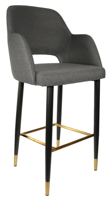 Made in Europe Brand: Durafurn 38mm black powdered steel tube with tapered leg Gold flec stainless steel foot ring High quality foam & vinyl SWL:150kg 3-year warranty Stocked in (upholstery): Anthracite, Black & Taupe Vinyl - Anthracite, Light Grey & Navy Woven Fabric - Tan, Mocha & Charcoal Premium Vinyl - Avocado & Denim Velvet Stocked in (leg frame): Black Metal Legs with gold tips and footrail Suitable for indoor commercial application Dimensions: 1050H x 570W 600D x 745 Seat Height Extensive selection of frame & upholstery choices available for custom orders Supplied unassembled