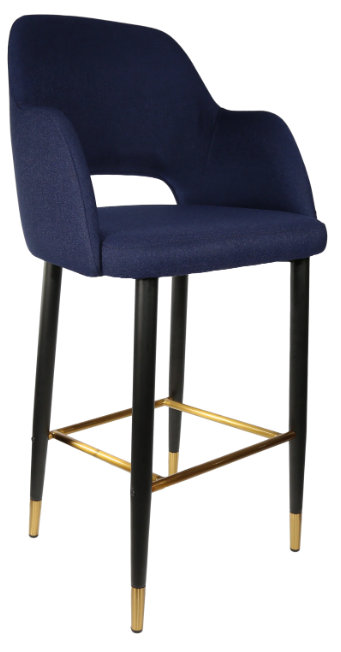 Made in Europe Brand: Durafurn 38mm black powdered steel tube with tapered leg Gold flec stainless steel foot ring High quality foam & vinyl SWL:150kg 3-year warranty Stocked in (upholstery): Anthracite, Black & Taupe Vinyl - Anthracite, Light Grey & Navy Woven Fabric - Tan, Mocha & Charcoal Premium Vinyl - Avocado & Denim Velvet Stocked in (leg frame): Black Metal Legs with gold tips and footrail Suitable for indoor commercial application Dimensions: 1050H x 570W 600D x 745 Seat Height Extensive selection of frame & upholstery choices available for custom orders Supplied unassembled