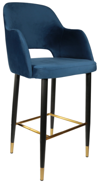 Made in Europe Brand: Durafurn 38mm black powdered steel tube with tapered leg Gold flec stainless steel foot ring High quality foam & vinyl SWL:150kg 3-year warranty Stocked in (upholstery): Anthracite, Black & Taupe Vinyl - Anthracite, Light Grey & Navy Woven Fabric - Tan, Mocha & Charcoal Premium Vinyl - Avocado & Denim Velvet Stocked in (leg frame): Black Metal Legs with gold tips and footrail Suitable for indoor commercial application Dimensions: 1050H x 570W 600D x 745 Seat Height Extensive selection of frame & upholstery choices available for custom orders Supplied unassembled