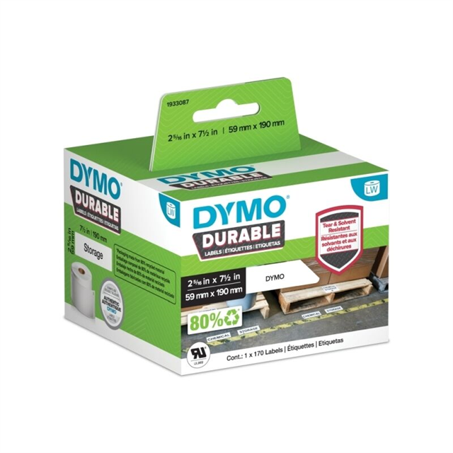 Dymo LabelWriter Durable Multi Purpose Labels 59mm x 190mm feature industrial-strength adhesive and a rugged coating that resists peeling and abrasion caused by moisture and solvents