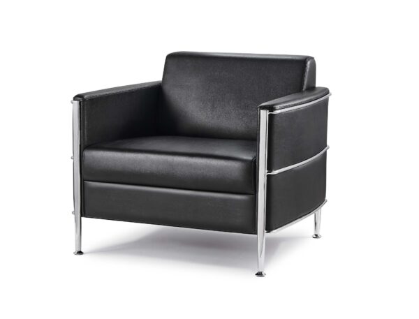 The Eclipse Lounge Range offers a contemporary seating solution with a chrome wrap-around frame and black PU leather upholstery