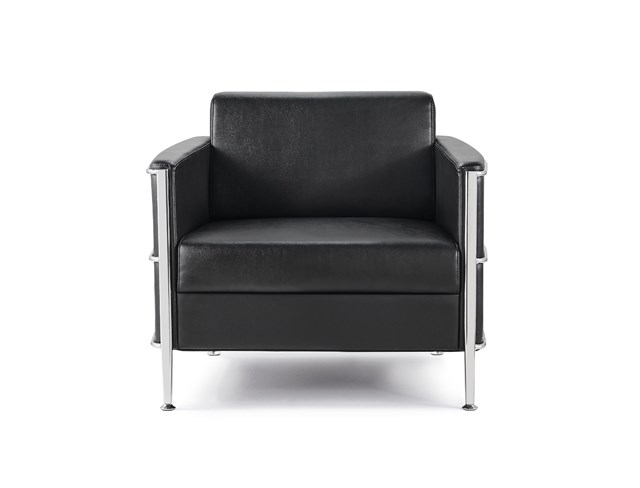 Eclipse Single Seater Lounge - Black PU 760mm W x 730mm D x 730mm H Chrome Wrap Around Frame with Black PU Leather Upholstery Seat Width: 540mm Seat Depth: 500mm Seat Height: 435mm Back Width: 550mm Back Height: 320mm Adjustable Feet For Leveling Purposes Tested To BS EN 12520:2015 Standard Martindale Rating On Black PU Leather: 70,000 150kg Weight Rating 3 Year Warranty