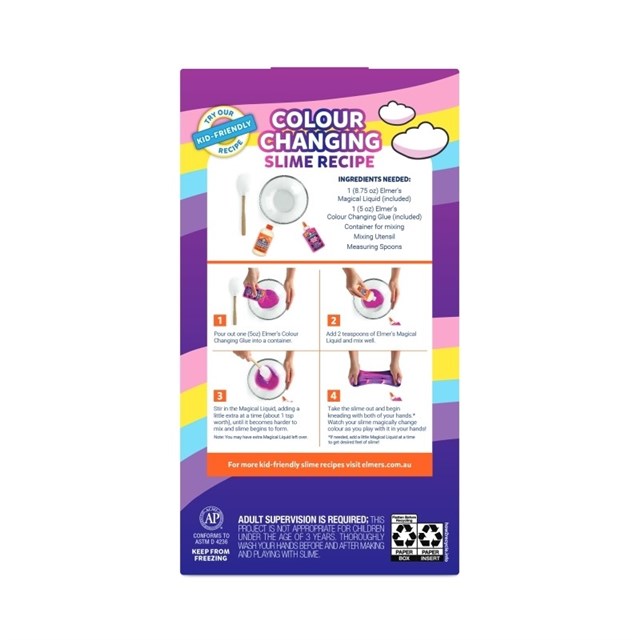 Elmers Dinosaur Night Slime Kit Bx4 includes everything you need to create colour-changing slime! Kit includes: 1 bottle of Elmer's Magical Liquid Slime Activator (258ml) 1 bottle of Blue Glow in the Dark Glue (147 ml)