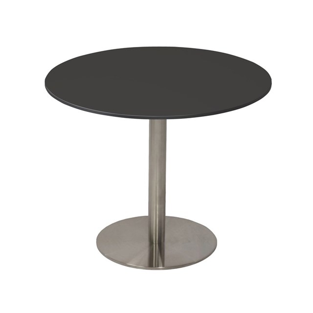 Estilo 1200mm Dia Round Table - Black Table Top 540mm Dia Disc Base Plate x 755mm H Overall Base Finished In Stainless Steel Adjustable Levelling Feet E0 Enviroboard Suitable For Indoor Use 5 Year Warranty