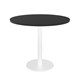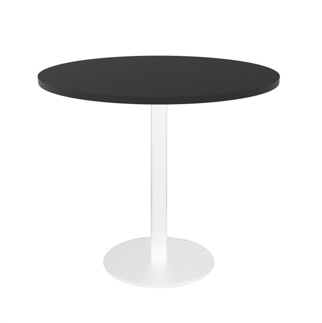 Estilo 900mm Dia Round Table - Black Table Top 540mm Dia Disc Base Plate x 755mm H Overall Base Finished In White Powder Coat Adjustable Levelling Feet E0 Enviroboard Suitable For Indoor Use 5 Year Warranty