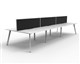 Eternity 6 Person Double Sided Workstation - With Screen Natural White Worksurface With 410mm W x 50mm D Scallop Cable Access 3600mm W x 1530mm D x 1200mm H ( Overall ) 1200mm W x 750mm D x 730mm H Per User 60mm x 30mm Splayed Leg Underframe In White P/C 495mm H x 30mm T Pinnable Privacy Screen Upholstered In Black Fabric With Matching White P/C Extrusion Dual Cross Bar For Added Stability E0 Enviroboard Melamine Worksurface Adjustable leveling Feet 5 Year Warranty AFRDI Certified