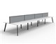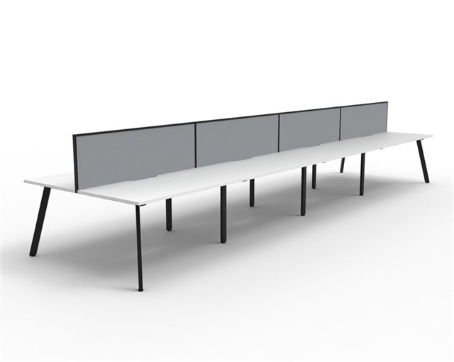 Eternity 8 Person Double Sided Workstation - With Screen Natural White Worksurface With 410mm W x 50mm D Scallop Cable Access 7200mm W x 1530mm D x 1200mm H ( Overall ) 1800mm W x 750mm D x 730mm H Per User 60mm x 30mm Splayed Leg Underframe In Black P/C 495mm H x 30mm T Pinnable Privacy Screen Upholstered In Grey Fabric With Matching Black P/C Extrusion Dual Cross Bar For Added Stability E0 Enviroboard Melamine Worksurface Adjustable leveling Feet 5 Year Warranty AFRDI Certified