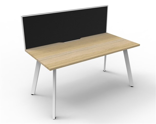 Eternity 1 Person Single Sided Workstation - With Screen Natural Oak Worksurface With 410mm W x 50mm D Scallop Cable Access 1200mm W x 780mm D x 730mm H ( Overall ) 1200mm W x 750mm D x 730mm H Per User 60mm x 30mm Splayed Leg Underframe In White P/C 495mm H x 30mm T Pinnable Privacy Screen Upholstered In Black Fabric With Matching White P/C Extrusion Dual Cross Bar For Added Stability E0 Enviroboard Melamine Worksurface Adjustable leveling Feet 5 Year Warranty AFRDI Certified