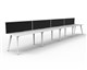 Eternity 4 Person Single Sided Workstation - With Screen Natural White Worksurface With 410mm W x 50mm D Scallop Cable Access 7200mm W x 780mm D x 730mm H ( Overall ) 1800mm W x 750mm D x 730mm H Per User 60mm x 30mm Splayed Leg Underframe In White P/C 495mm H x 30mm T Pinnable Privacy Screen Upholstered In Black Fabric With Matching White P/C Extrusion Dual Cross Bar For Added Stability E0 Enviroboard Melamine Worksurface Adjustable leveling Feet 5 Year Warranty AFRDI Certified