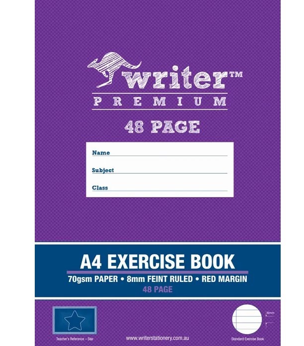 Exercise Book Writer Premium A4 48pg 8mm Ruled Margin Each (Sold as Each, 20 in a Pack)
