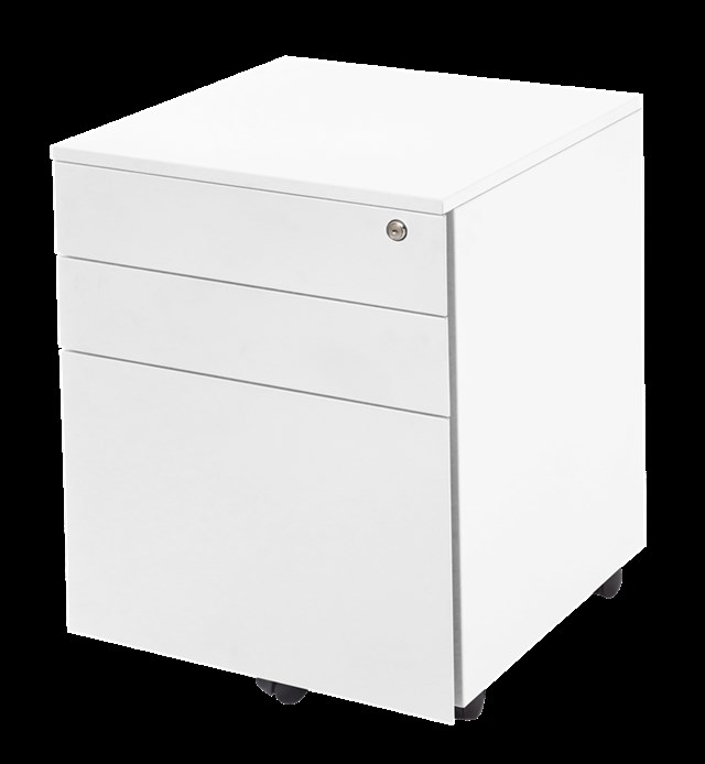 Rapidline 3 Drawer Steel Mobile Pedestal - White China 610mm H x 460mm W x 475mm D 2 Personal Drawers and 1 File Drawer Ball Bearing Runners and 5th Wheel For Added Stability Master Key Locking Series 10 Year Warranty