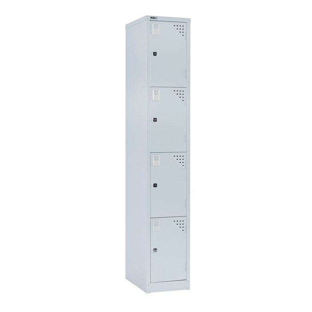 GO Four Tier Locker - Silver Grey ASSEMBLED 1830mm H x 305mm W x 455mm D Name Tag Holder and Vented Doors 1 Shelf Per Compartment Master Key Series Full Length Stiffeners Fitted To Every Door 10 Year Warranty