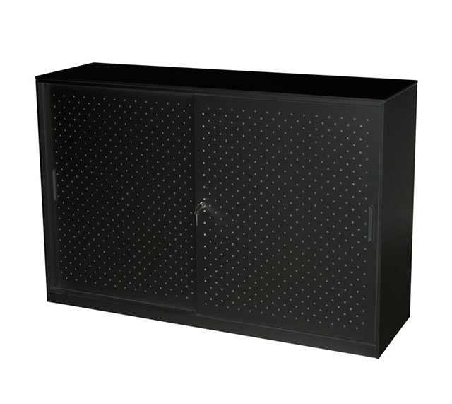 ** ASSEMBLED ** Go Perforated Sliding Door Cupboard - Black P/C 1530mm W x 1016mm H x 473mm D Includes 2 x Adjustable Shelves ( 1 Each Side ) Perforated Door Feature With Internal Acoustic Panel For Sound Absorption Adjustable Leveling Feet Soft Closing Track System Requires In House Assembly 0.7mm Cold Roll Steel Plate For Carcass And 0.8MM For Doors 10 Year Warranty