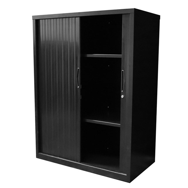 GO Tambour Door Unit with Shelves - 1200mm H - Black 1200mm H x 900mm W x 473mm D Two Shelves Included Unit Supplied With 2 Keys Fully Riveted For Extra Strength Master Key Series Adjustable leveling Feet Magnetic Slam Rail 10 Year Warranty