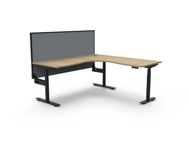 Halo Plus Corner Workstation - Natural Oak/ Black Satin 1500mm W x 1500mm W x 750mm D x 620mm - 1270mm H E0 Rated 25mm T Table Top Finished In Natural Oak With Rigid Edging & 80mm Dia Cable Entry With Cover Round Leg Underframe Finished In Black Satin Powder Coat 1500mm W x 900mm H x 30mm T Pinnable Privacy Screen Finished In Grey Fabric With Matching Black P/C Extrusion Digital Control Panel With 3 Pre-Set Positions, LED Display Panel, Keypad Safety Lock & Reminder Alarm Setting Anti- Collision & Anti-Tilt Technology Column Size: 70mm Dia Height Range: 595mm-1245mm ( Without Table Top ) Lifting Capacity: 140 Kg Max Speed: 38mm Per Second Adjustable Leveling Feet Dual Motor Foot Size: 700mm Of Main Desk + 500mm For Return Frame Desk Mounting Top Plate Size: 500mm Steel Gauge: 3.0mm, 2.0mm & 1.5mm Used Throughout Noise Emission: <50DB Surge Immunity: 1kV(L1 to L2) / 2kV(L1,L2 To PE) ESD Protection: +-4.0kV ( Contact Discharge )/+-8.0kV ( Air Discharge ) Input Power: 110-240V Transformer Power:128W (.03W On Standby ) SAA and C Tick Certification Additional Items Also Available Include: Fully Ducted Cable Tray Complete With Power & Data Punchouts Internal & External To Tray ( B2-SSCT15 ) Bluetooth Control Box ( B2-BTCB ) Cable Tray Bridge ( B2-SSBR ) Flexible Cable Snake ( B2-CBSNAKE ) Battery Pack ( B2-BATT ) 10 Year Warranty