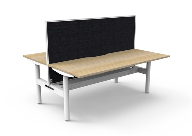 Halo Static Back To Back Workstation With Screen and Cable Tray - Natural Oak/ White Satin 1800mm W x 1500mm D x 730mm H (Overall) 1800mm W x 750mm D x 730mm H (Per User) Overall Height AFFL including Screen: 1330mm H E0 Rated 25mm T Table Top Finished In Natural Oak With Rigid Edging & 50mm D Scallop Cut Out To Rear Underframe Finished In White Satin Powder Coat Fully Ducted Cable Tray With Punchout For Power & Data To be Fitted To Either External Or Internal Of Frame 1800mm W x 900mm H x 30mm T Pinnable Privacy Screen Finished In Black Fabric With Matching White P/C Extrusion Column Size: 70mm Dia Frame Height: 705mm ( Without Table Top ) Adjustable Levelling Feet Desk Mounting Top Plate Size: 500mm Steel Gauge: 3.0mm, 2.0mm & 1.5mm Used Throughout Additional Items Also Available Include: Cable Tray Bridge ( B2-B2BBR ) Flexible Cable Snake ( BH-HDSNAKE ) 10 Year Warranty