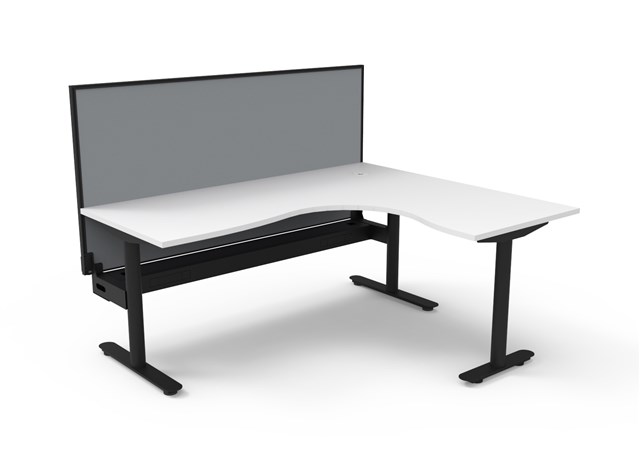 Halo Static Corner Workstation - Natural White/ Black Satin 1800mm W x 1500mm W x 750mm D x 730mm H E0 Rated 25mm T Table Top Finished In Natural White With Rigid Edging & 80mm Dia Cable Entry With Cover Underframe Finished In Black Satin Powder Coat Fully Ducted Cable Tray With Punchout For Power & Data To be Fitted To Either External Or Internal Of Frame 1800mm W x 900mm H x 30mm T Pinnable Privacy Screen Finished In Grey Fabric With Matching Black P/C Extrusion Column Size: 70mm Dia Frame Height: 705mm ( Without Table Top ) Adjustable Levelling Feet Foot Size: 700mm Of Main Desk + 500mm For Return Frame Desk Mounting Top Plate Size: 500mm Steel Gauge: 3.0mm, 2.0mm & 1.5mm Used Throughout Additional Items Also Available Include: Cable Tray Bridge ( B2-SSBR ) Flexible Cable Snake ( BH-HDSNAKE ) 10 Year Warranty