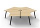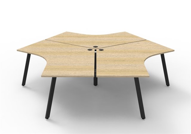 Deluxe Infinity 3 Person 120 Degree Workstation - No Screen Natural Oak Worksurface With 1 x 80mm Dia Cable Entry Hole 2866mm W x X 2480mm D x 730mm H ( Overall ) 1205mm W x 1205mm D x 730mm H Per User 60mm x 30mm Eternity Leg Underframe In Black P/C 30mm Cable Access Void In Between Double Sided Users Infill Rail Available At An Additional Cost Dual Cross Bar For Added Stability E0 Enviroboard Melamine Worksurface Adjustable leveling Feet 5 Year Warranty