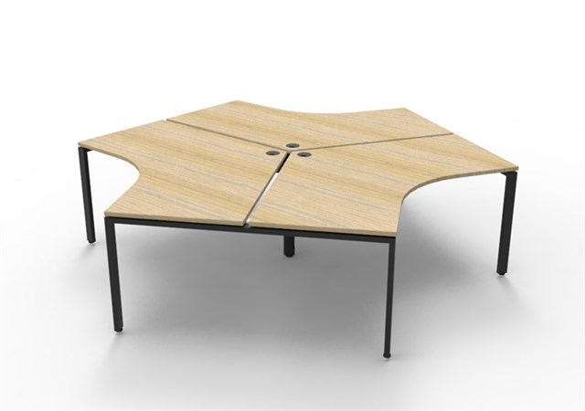 Deluxe Infinity 3 Person 120 Degree Workstation - No Screen Natural Oak Worksurface With 1 x 80mm Dia Cable Entry Hole 2866mm W x X 2480mm D x 730mm H ( Overall ) 1205mm W x 1205mm D x 730mm H Per User 60mm x 30mm Profile Leg Underframe In Black P/C 30mm Cable Access Void In Between Double Sided Users - Infill Rail Avail