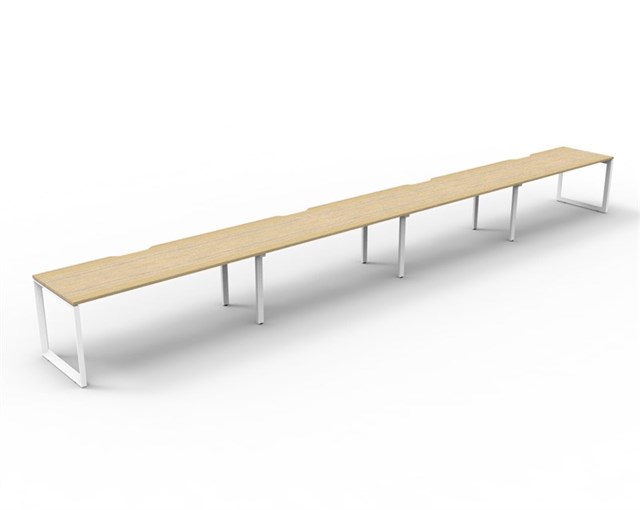 Deluxe Rapid Infinity 4 Person Single Sided Workstation - No Screen Natural Oak Worksurface With 410mm W x 50mm D Scallop Cable Access 7200mm W x 750mm D x 730mm H ( Overall ) 1800mm W x 750mm D x 730mm H Per User 60mm x 45mm Beveled Edge Loop Leg Underframe In White P/C Dual Cross Bar For Added Stability E0 Enviroboard Melamine Worksurface Adjustable leveling Feet 5 Year Warranty AFRDI Certified