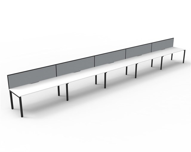 Deluxe Rapid Infinity 5 Person Single Sided Workstation - With Screen Natural White Worksurface With 410mm W x 50mm D Scallop Cable Access 6000mm W x 780mm D x 730mm H ( Overall ) 1200mm W x 750mm D x 730mm H Per User 60mm x 30mm Profile Leg Underframe In Black P/C 495mm H x 30mm T Pinnable Privacy Screen Upholstered In Grey Fabric With Matching Black P/C Extrusion Dual Cross Bar For Added Stability E0 Enviroboard Melamine Worksurface Adjustable leveling Feet 5 Year Warranty AFRDI Certified