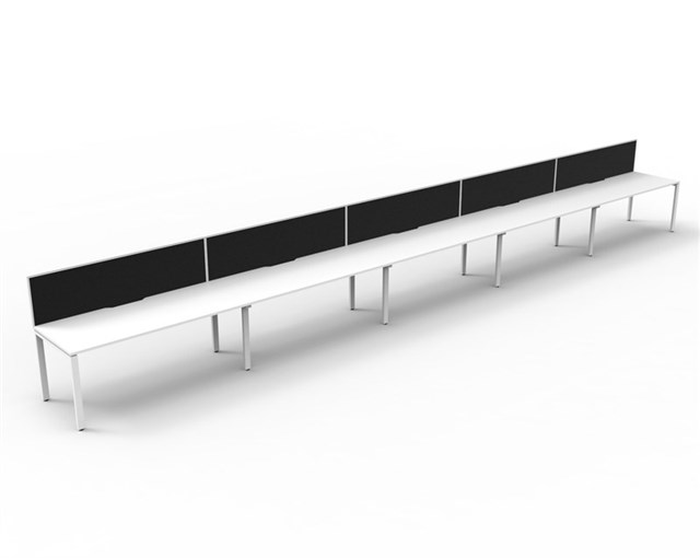 Deluxe Rapid Infinity 5 Person Single Sided Workstation - With Screen Natural White Worksurface With 410mm W x 50mm D Scallop Cable Access 6000mm W x 780mm D x 730mm H ( Overall ) 1200mm W x 750mm D x 730mm H Per User 60mm x 30mm Profile Leg Underframe In White P/C 495mm H x 30mm T Pinnable Privacy Screen Upholstered In Black Fabric With Matching White P/C Extrusion Dual Cross Bar For Added Stability E0 Enviroboard Melamine Worksurface Adjustable leveling Feet 5 Year Warranty AFRDI Certified