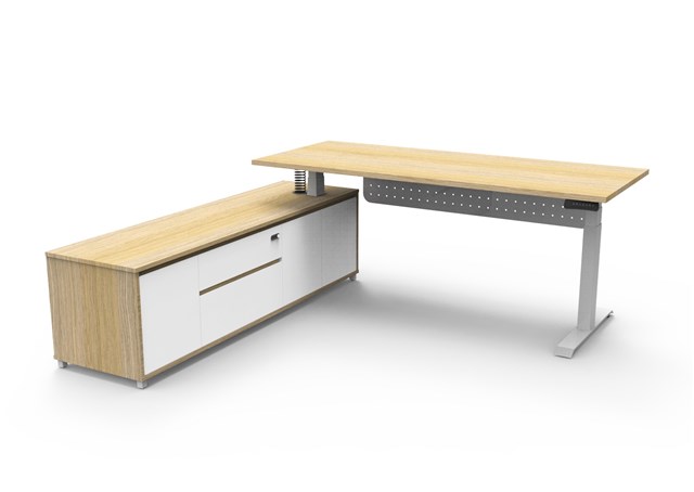 Boost Plus Executive Desk *LEFT* Hand Side Configuration With Modesty Panel - Natural Oak/ White Satin Desk: 1800mm W x 900mm D x 620mm - 1270mm H Side Cabinet: 1800mm W x 500mm D x 520mm H Table Top Finished In Natural Oak With Matching Edge Tape - No Cable Entry Holes Or Scallops Includes Arch Perforated Steel Modesty Panel Finish In White P/C - 1300mm W x 300mm H Side Cabinet Finished With Natural Oak Carcass - Natural White Drawer And Door Fronts Fitted With White P/C Legs 2 x Pull Out Drawers 1 x Double Swing Door Cupboard 1 x Single Swing Door Cupboard With Adjustable Shelf Soft Close Hinges And Runners Drawers Fitted With Cyberlock 4 Digit Manual Combination Lock Boost Plus Height Adjustable Dual Motor Underframe Finished In White Satin Powder Coat Digital Control Panel With 3 Pre-Set Positions, LED Display Panel, Keypad Safety Lock & Reminder Alarm Setting Anti- Collision & Anti-Tilt Technology Column Size: 90mm x 60mm Lifting Capacity: 120 Kg Max Speed: 38mm Per Second Adjustable Leveling Feet 1 x T Foot With 700mm W Foot Plate - 1 x Adjustable Leveling Foot Plate Steel Gauge: 3.0mm, 2.0mm & 1.5mm Used Throughout Max Speed: 38mm Per Second Noise Emission: <50DB Surge Immunity: 1kV(L1 to L2) / 2kV(L1,L2 To PE) ESD Protection: +-4.0kV ( Contact Discharge )/+-8.0kV ( Air Discharge ) Input Power: 110-240V Transformer Power:128W (.03W On Standby ) SAA and C Tick Certification 10 Year Warranty