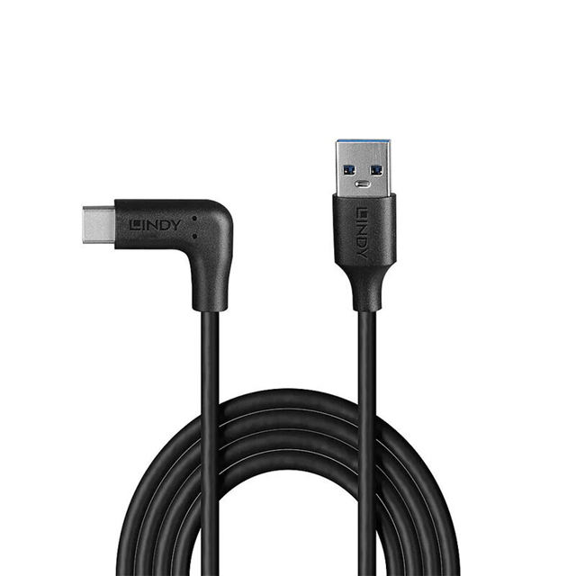 The Lindy 1.5m USB 3.2 Type A to Type C Right-Angle Cable provides fast data transfer up to 10Gbps and efficient charging for compatible devices