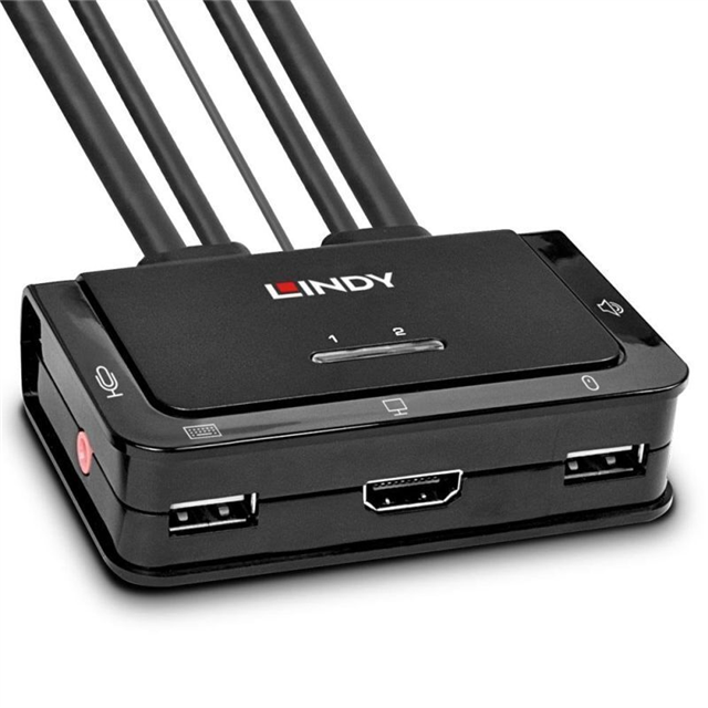 The Lindy 2 Port HDMI 2.0, USB 2.0 & Audio KVM Switch is a compact solution for providing access and control over two HDMI equipped PCs from a single keyboard, mouse and monitor