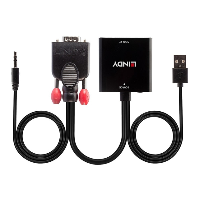 The Lindy VGA & Audio to HDMI Converter combines analogue video and stereo audio signals and converts them into a HDMI signal, perfect for using legacy PC and AV equipment with HDMI displays