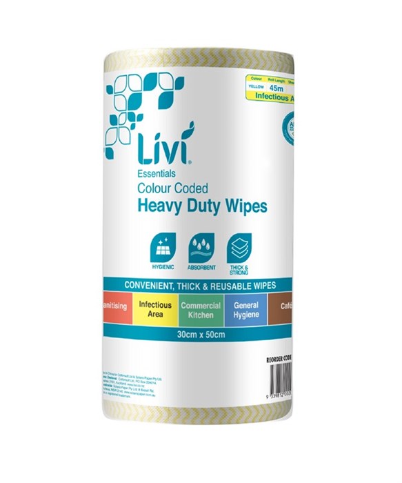 The Livi yellow commercial wipes has 90 sheets per roll & is perforated for controlled usage.