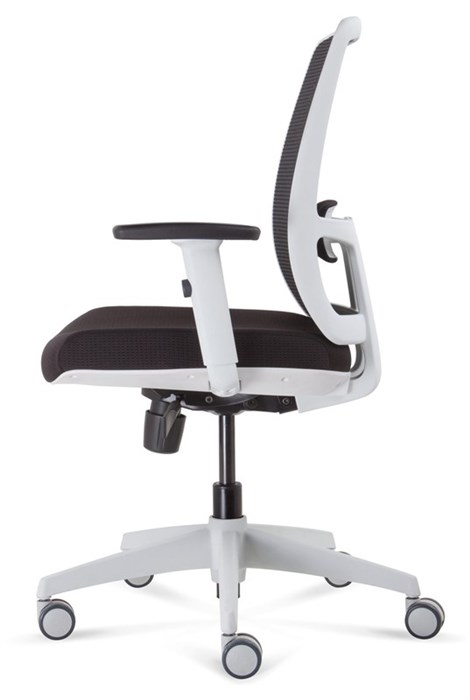 Promesh White Frame Chair - Black Fabric Synchro Mechanism with Gas Lift, Back Rest and Seat Pan Tilt Black Mesh Back Rest and Black Upholstered Seat Pan Seat Slide and Lumbar Support - Includes Removable Adjustable Arms White 5 Star Base On Castors 135kg Weight Rating BIFMA Tested GreenGuard GOLD Approved 10 Year Warranty