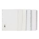 White economy dividers with a reinforced binding strip to prevent tearing and write your own titles on the blank tabs.