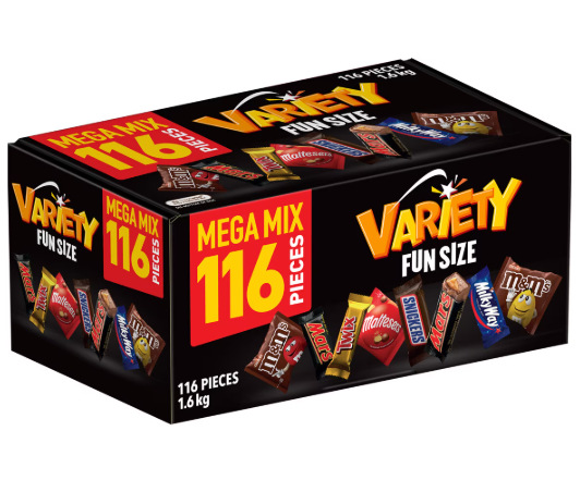 Bring the party to life with this 116-piece bulk box of fun-size chocolate favourites! Packed with a delicious mix of classic treats like caramel, nougat, crunchy biscuit, and colorful candy-coated chocolates, there’s something for everyone to enjoy