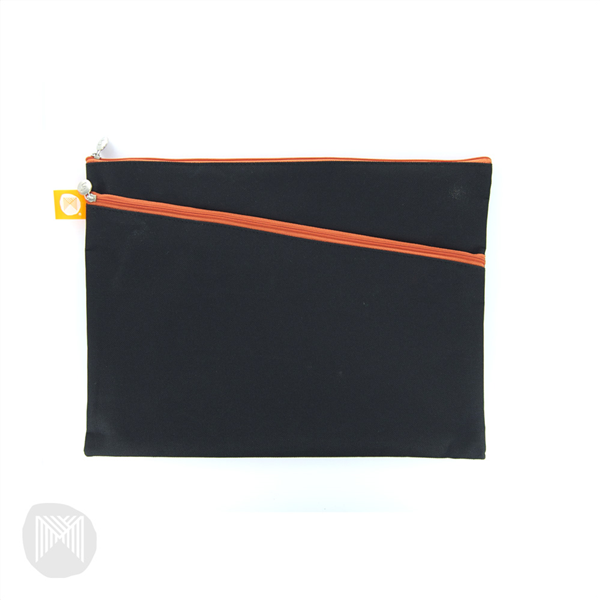 Pencil cases feature sturdy green and orange zips that stand out and look great against the black