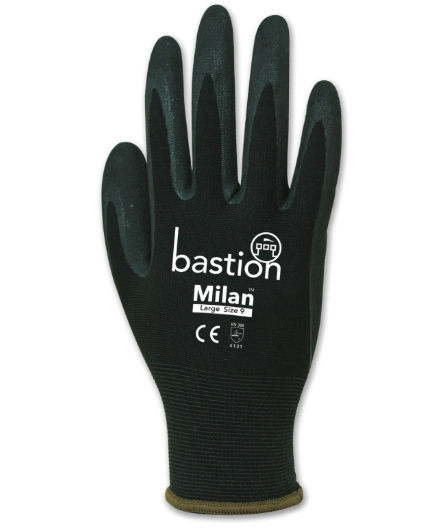 Milan gloves are a premium, general purpose glove Extremely comfortable with excellent dexterity Great for many applications from painting to brick laying Bastion Milan Black Nylon Gloves with Black Sandy Foam Nitrile Coating provides exceptional grip in dry, wet and oily conditions Double dipped nitrile coating for superior oil and water resistance Elastic knitted cuffs for comfortable secure fit