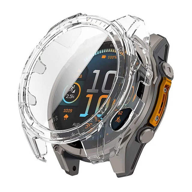 The Garmin Fenix 8 43mm clear watch case with integrated tempered glass screen protector delivers complete protection from scratches, impacts, and daily wear
