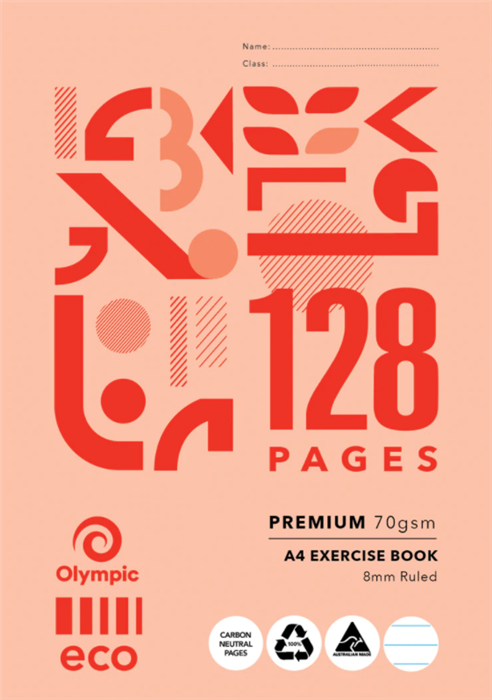 Olympic Eco Exercise Book A4 8mm 128 Page (Sold as Each, 10 in a Pack)