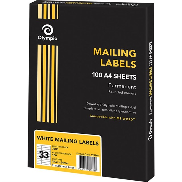 - Suitable for laser and inkjet printing - With convenient rounded edges for easy removal and available in a range of useful sizes - Always rely on Olympic Mailing Labels - Compatible with MS Word standard label templates - Ideal for general purpose mailing and filing - Permanent, adhesive, white mailing labels - Acid Free labels