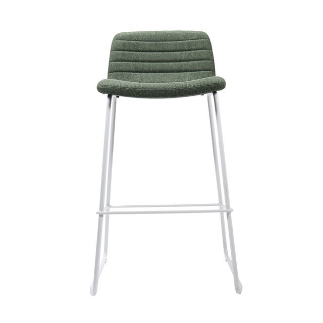 Pixel Counter Stool - Olive/White 480mm W x 535mm D x 845mm H ( Overall ) Olive Fabric Upholstery With Ribbed Stitching Detail Sled Base With Foot Rail Finished In White P/C Seat Width: 440mm Seat Depth: 390mm Back Height: 240mm Back Width: 440mm - 390mm Seat Height: 630mm 110 Kg Weight Rating 5 Year Warranty