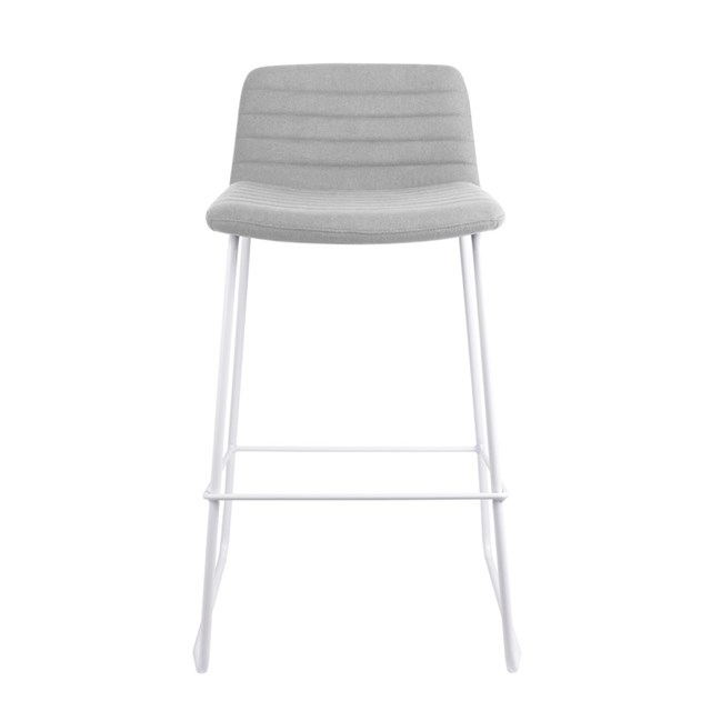 Pixel High Stool - Light Grey/White 480mm W x 535mm D x 945mm H ( Overall ) Light Grey Fabric Upholstery With Ribbed Stitching Detail Sled Base With Foot Rail Finished In White P/C Seat Width: 440mm Seat Depth: 390mm Back Height: 240mm Back Width: 440mm - 390mm Seat Height: 730mm 110 Kg Weight Rating 5 Year Warranty