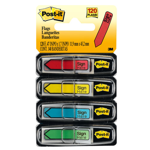 Post-it® Message Flags with "Sign Here" messaging in assorted colors and .47 inch wide size are ideal for marking documents without writing on them