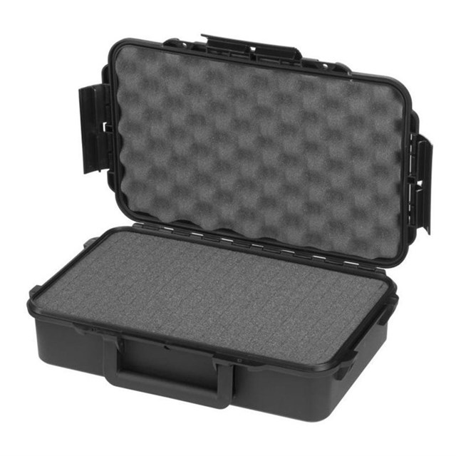 The case is made of durable polypropylene copolymer and features a watertight seal, an automatic pressure release valve, and cubed foam to secure contents