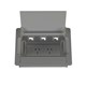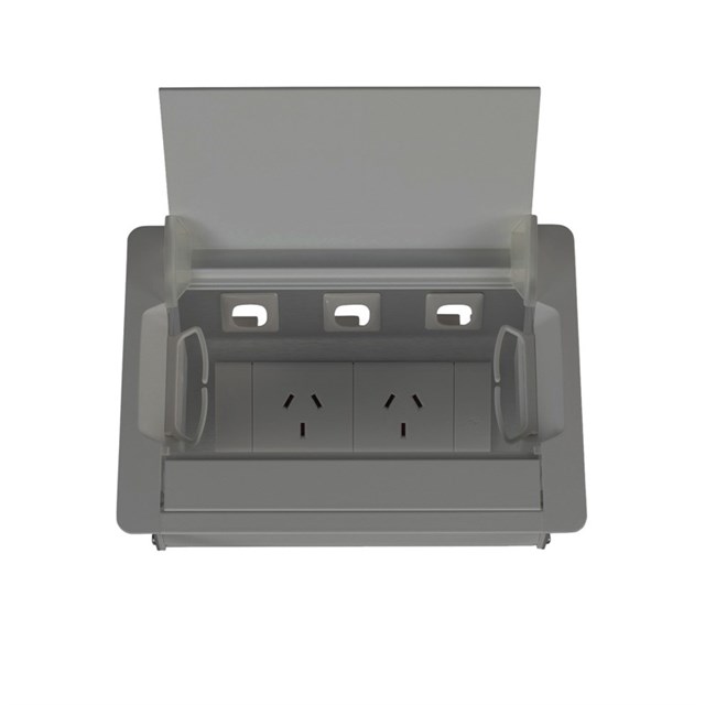 2 x Auto Switched GPO And Provisions For 3 Data 211.5mm W x 154mm D x 115mm H Anodised Silver Finish Curved Exterior Profile Dual Cable Exits, Front And Sides With Additional Attachments For Cable Guides Integrated tablet device display stand (when lid is open) Fully segregated for power and data