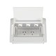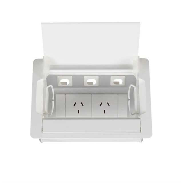 2 x Auto Switched GPO And Provisions For 3 Data 211.5mm W x 154mm D x 115mm H White Powder Coat Finish Curved Exterior Profile Dual Cable Exits, Front And Sides With Additional Attachments For Cable Guides Integrated tablet device display stand (when lid is open) Fully segregated for power and data