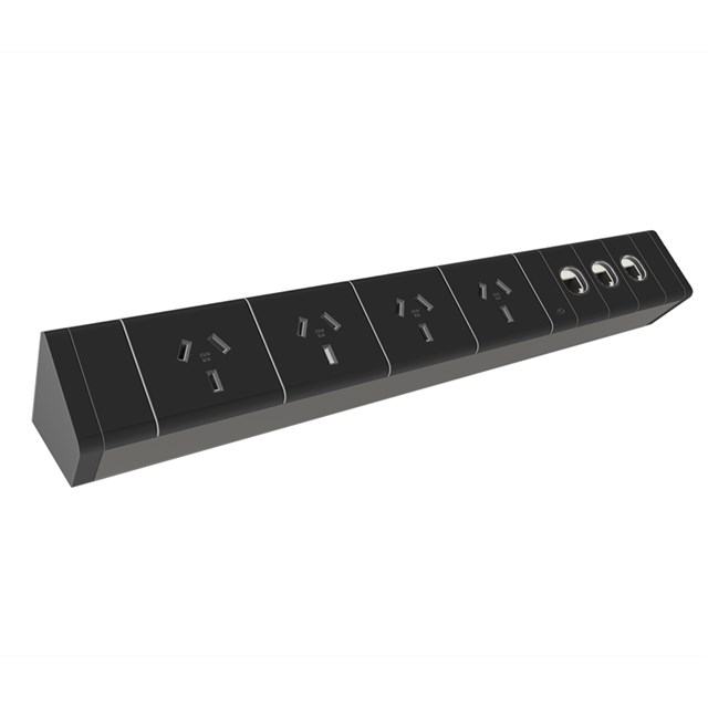 Athena Rail Kit - 4 GPO + 3 Data - Black 4 x 10AMP Auto Switched Socket Outlet (2 x Rotated) 3 x 25mm Data Tiles 1000mm Lead, D Splitter & Desk Clamps 2 Year Warranty